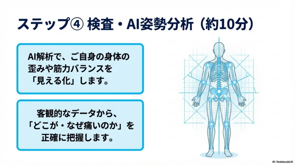 当院ではAI解析による姿勢・動作分析を行い、身体の歪みや筋力バランスを数値で「見える化」します。関節の可動域や筋力の検査も合わせて実施し、「どこが・なぜ痛いのか」を客観的に把握します。