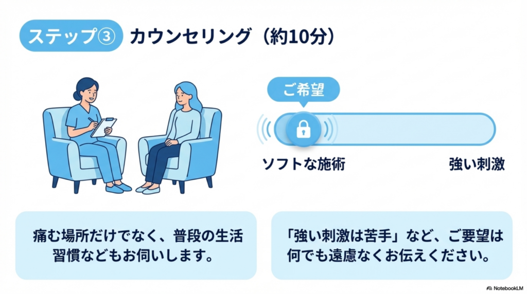 ここで大切なのは、遠慮なくお気持ちを伝えていただくことです。「強い刺激は苦手」「ボキボキされるのは怖い」といったご希望があれば、施術プランに反映しますので、何でもおっしゃってください。