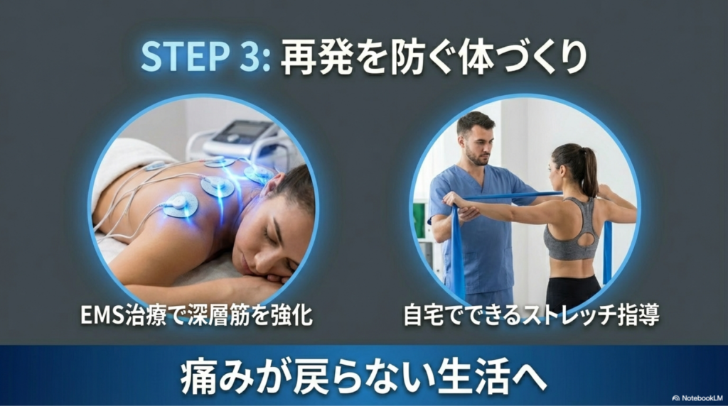 | 第3期:回復期(解凍期) | 9ヶ月〜1年以上 | 痛みはほぼなし、動きが徐々に改善 | 筋力強化、再発予防 |