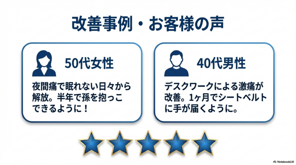 A. 夜間痛は、四十肩・五十肩の中でも特につらい症状です。当院のハイボルト治療や鍼灸治療により、多くの方が2週間〜1ヶ月で夜間痛の軽減を実感されています。早めの治療開始が改善のカギです。