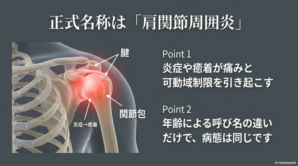 四十肩・五十肩は、医学的には「肩関節周囲炎」と呼ばれる疾患です。肩関節を取り囲む筋肉、腱、靭帯、関節包(関節を包む袋状の組織)などに炎症や癒着が起こり、痛みと可動域制限を引き起こします。
