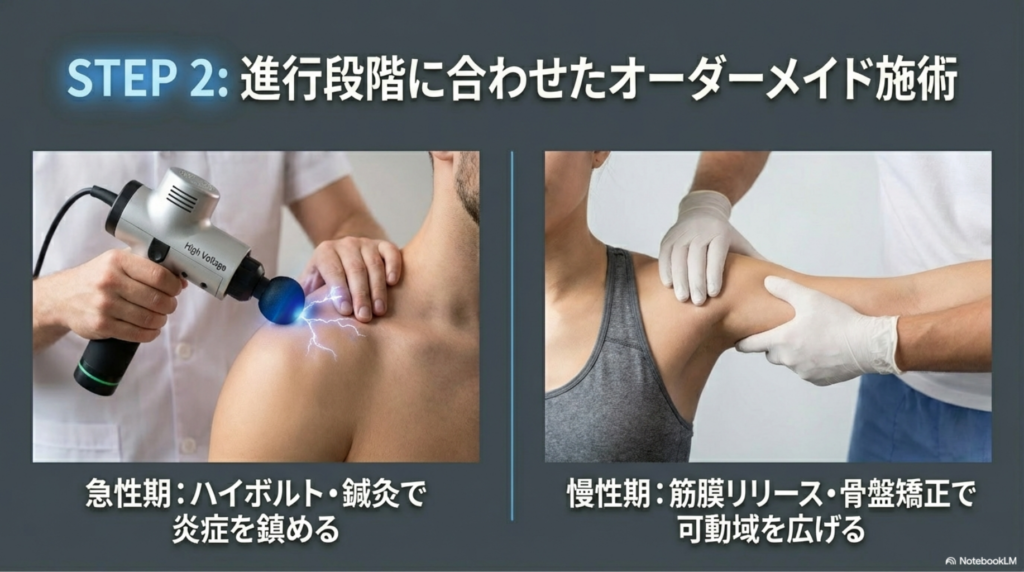 A. はい、できます。急性期(痛みが強い時期)は、炎症を抑えることを最優先に、ハイボルト治療や鍼灸治療で痛みを軽減します。無理に動かすことはせず、痛みのない範囲で適切にアプローチします。