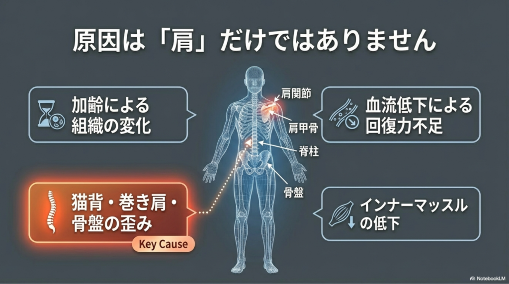 四十肩・五十肩は、単一の原因ではなく、複数の要因が重なり合って発症します。