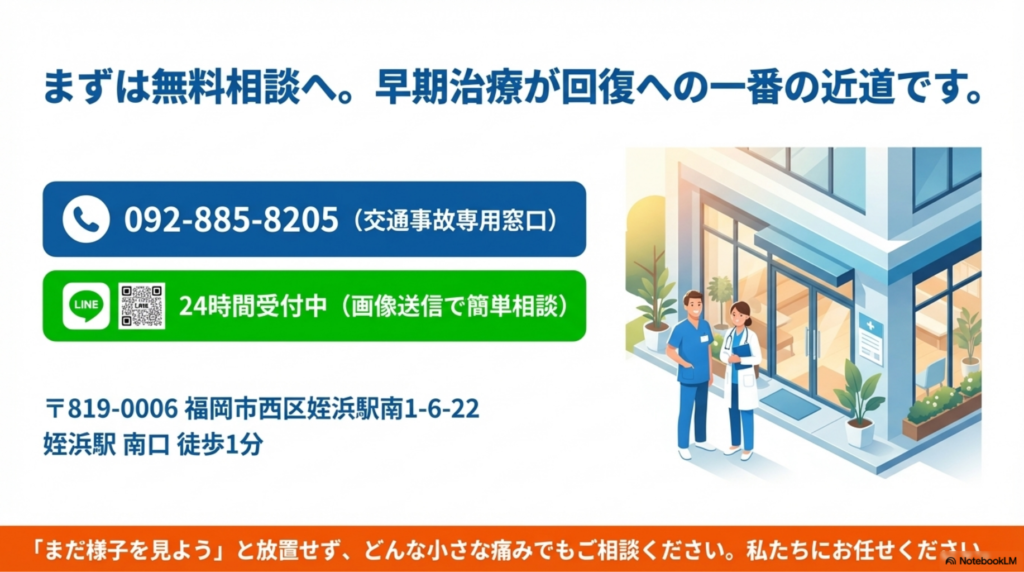 A. 早いほど回復も早くなります。交通事故後の腰痛は、事故直後より48〜72時間後に炎症が進行して悪化するケースが多くあります。「軽いから大丈夫」と放置すると慢性化・坐骨神経痛への移行リスクが高まります。症状が軽い段階での来院が、最も早く・確実に回復する方法です。