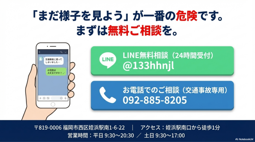 むちうちは事故直後より48〜72時間後に症状が悪化するケースが大半です。「軽い事故だから大丈夫」「病院でレントゲン異常なしと言われたから安心」という判断が、後遺症や長期化を招く最大の原因です。
