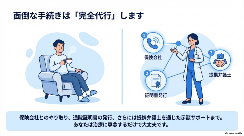 - 後遺障害診断書の取得サポート(提携整形外科を通じて)