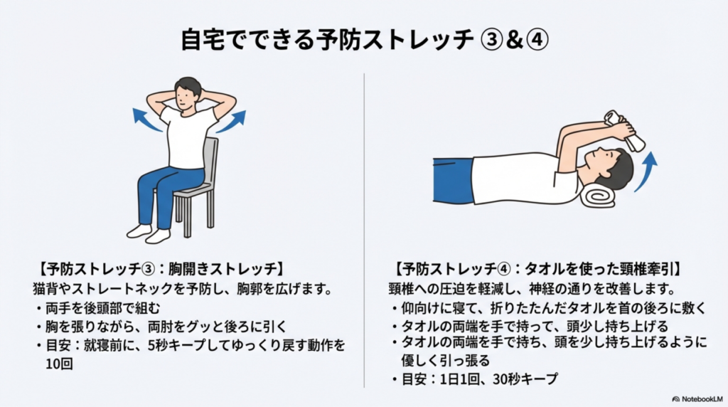 【予防ストレッチ④】タオルを使った頸椎牽引(1日1回・30秒)