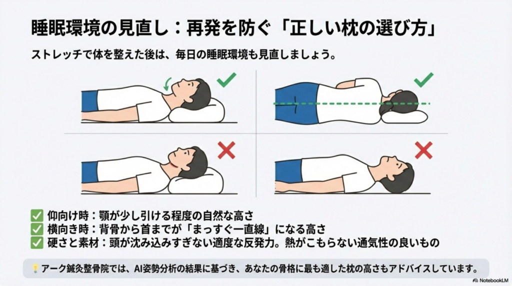| 低すぎる枕 | ⚠️ 頸椎が反りすぎて靭帯に負荷 |