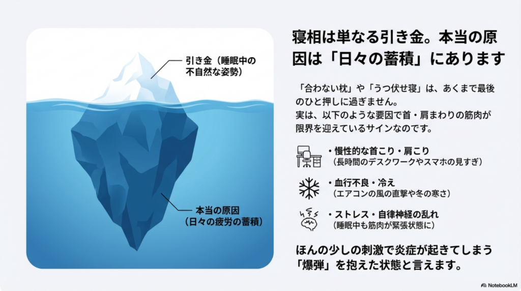 多くは「寝ている間に不自然な姿勢が長時間続いた」ことで発症しますが、実は日ごろの体の使い方や疲労の蓄積がベースにあり、睡眠中の姿勢はあくまで「最後の引き金」にすぎないことがほとんどです。