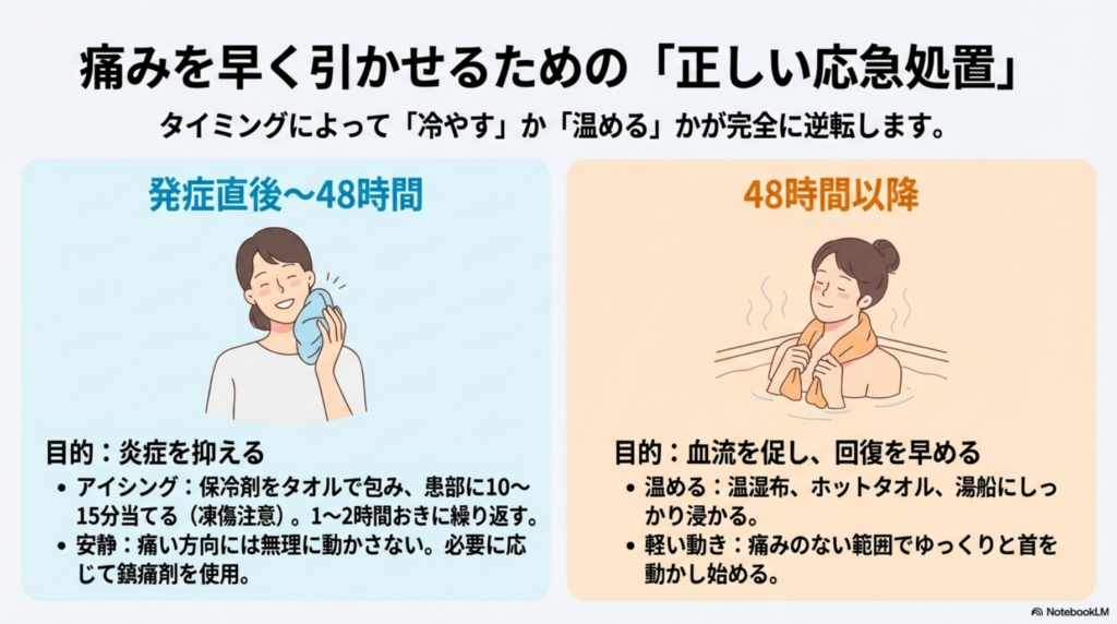 A. 発症後48時間は冷湿布、その後は温湿布が基本です。発症直後は炎症が起きているため、冷やして炎症を抑えます。48時間を過ぎてから温めることで血流が促進され、回復が早まります。