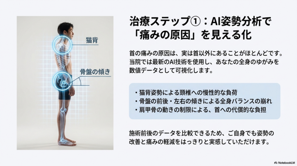 当院では AI姿勢分析の結果をもとに、あなたに最適な枕の高さをアドバイスしています。お気軽にご相談ください。
