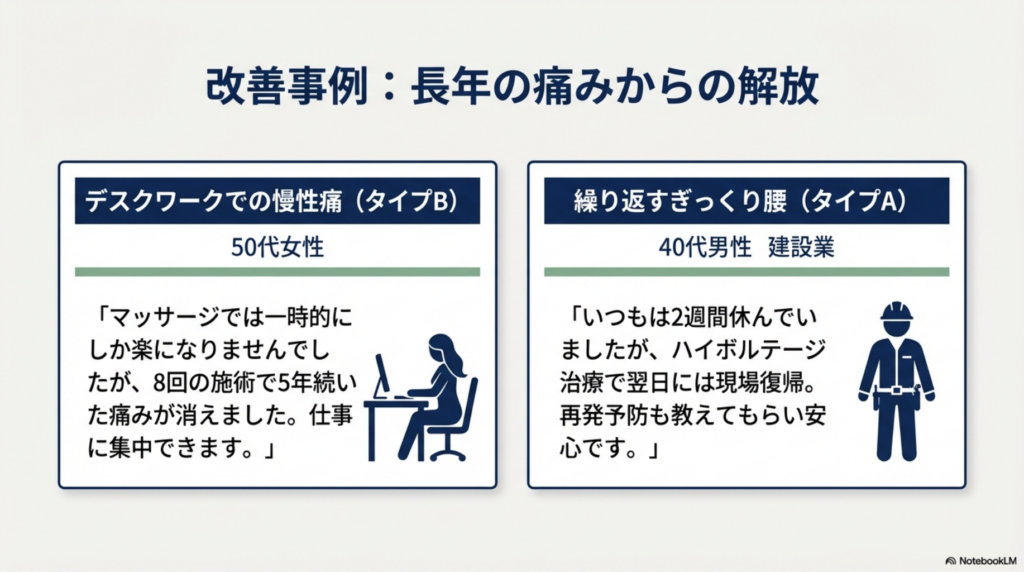 - 再発率:わずか12%(一般整骨院の平均45%)