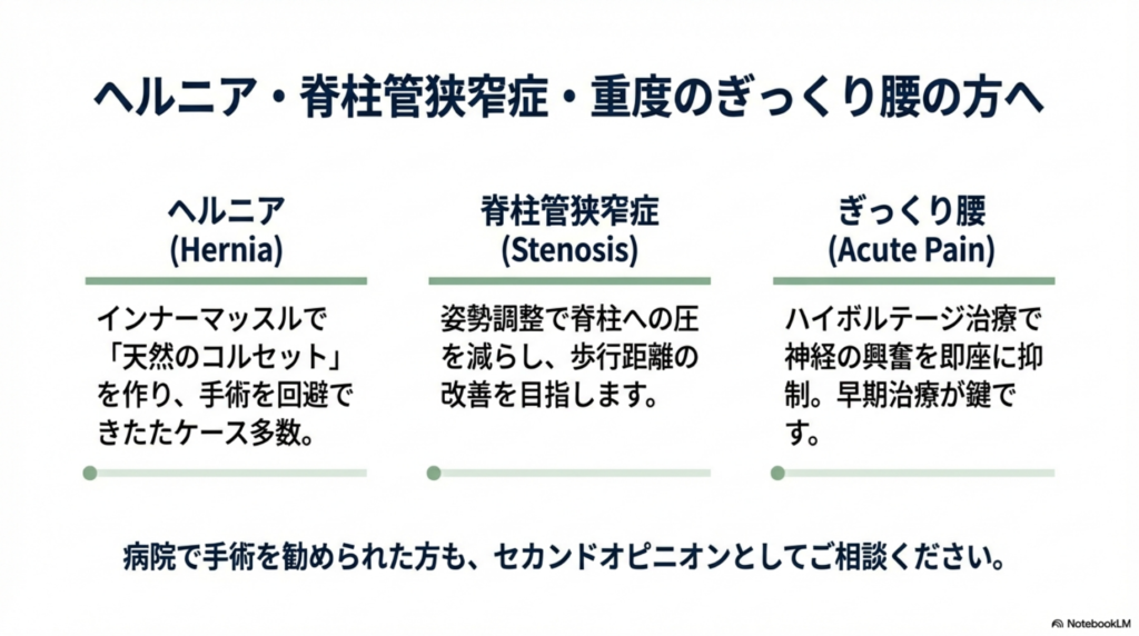 - 腰椎椎間板ヘルニア:足のしびれ・痛みを伴う腰痛。手術回避の実績多数。