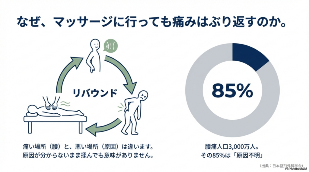 日本整形外科学会の調査によると、日本国内で腰痛に悩む人は約3,000万人。その85%は原因不明の非特異的腰痛とされています。